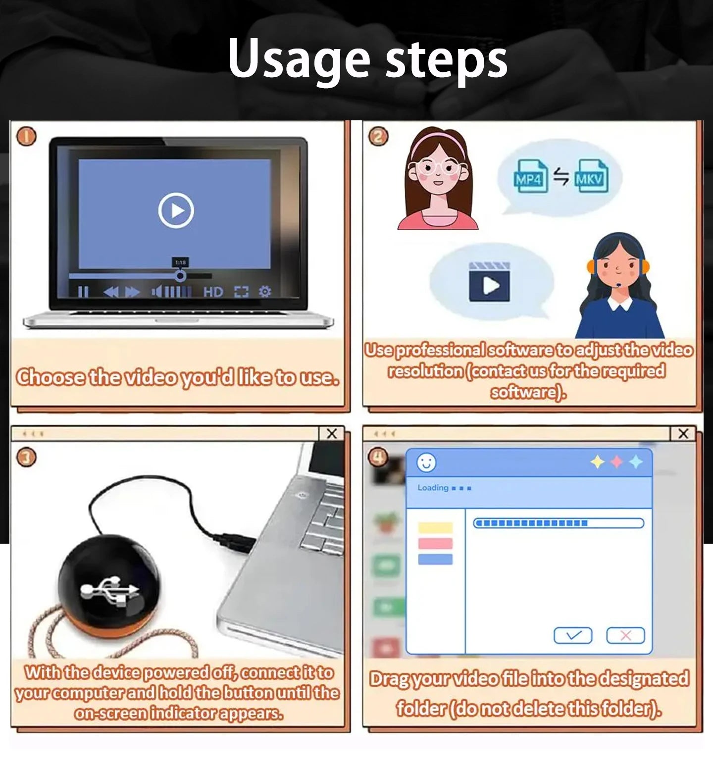 No complicated software. Simply connect the device to your computer using the included USB Type-C cable, then drag and drop your content into the memory folder.