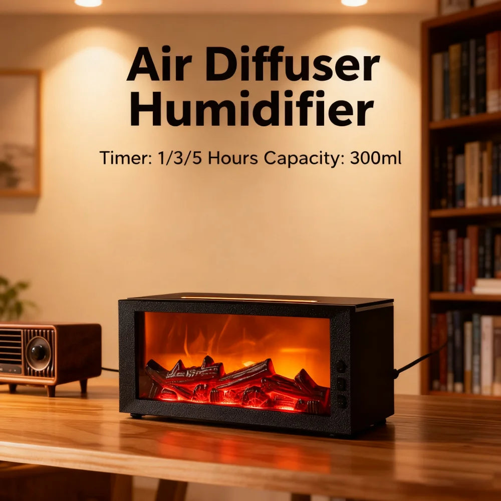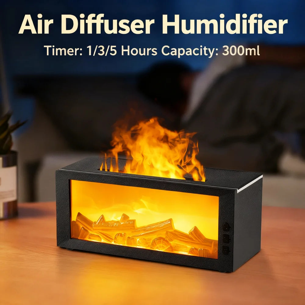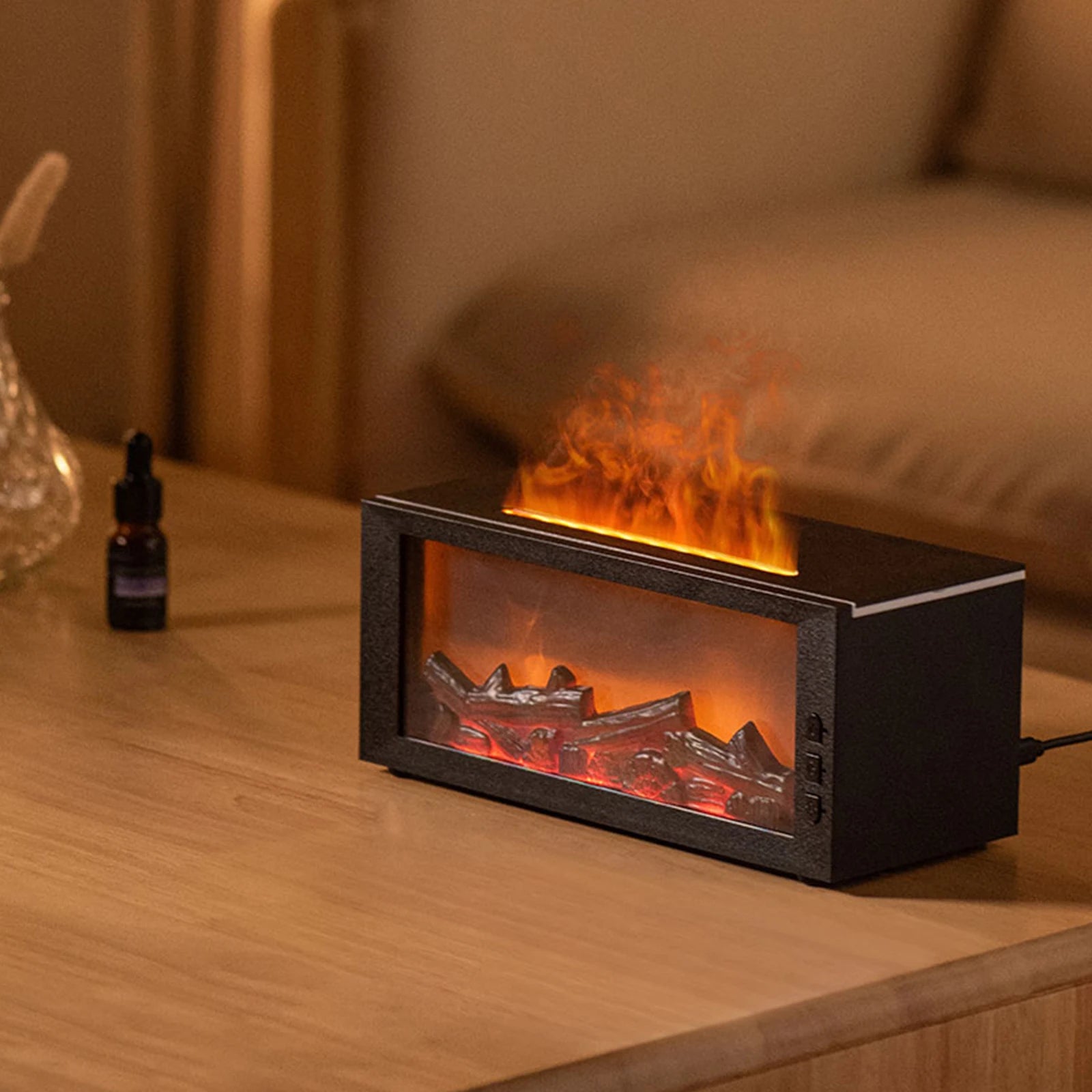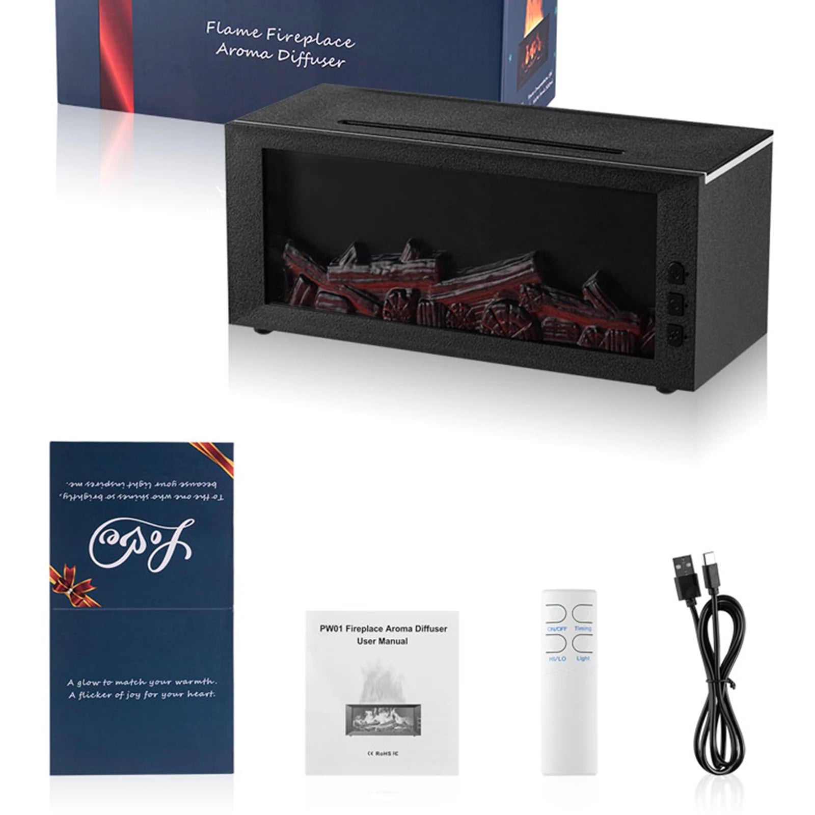 Features: 1.All-in-One Convenience: This air diffuser humidifier combines humidification, essential oil diffusion, a night light, and ambient lighting in one device. With a 300ml capacity, just add 3-5 drops of oil to fill your room with fragrance and soothing moisture, creating comfortable lighting for restful sleep. 2.Realistic Fireplace Experience: Designed with an ultra-realistic fireplace look and advanced misting technology, this essential oil diffuser transforms water and oils into a fine mist. The lifelike flame effect and warm glow add vibrancy and romance, making your space cozy and inviting. 3.Dynamic Flame & Fireplace Light Modes: Enjoy customizable lighting with both fire mist and fireplace color transitions. Easily pause on your favorite color or let it cycle automatically. The cool mist humidifier offers several vibrant hues to match any mood - great for parties, meditation, or peaceful evenings. 4.Smart Control & Safety Features: Operate this aroma diffuser with ease using premium materials, a timer (1/3/5H), and remote control. The intelligent auto shut-off function activates if water runs low, ensuring safe usage and peace of mind during daily operation. 5.Whisper-Quiet and Versatile: The aromatherapy diffuser is engineered for quiet performance, fostering a serene atmosphere wherever used. Improve air quality and relieve stress whether at home, work, or the bedroom, embracing true relaxation and wellness. Specification: Origin: Mainland China Material: ABS+PP Color: Black Rated Input: 5V 2A Rated Power: 5W Water Tank Capacity: 300ml Spray Volume: 15-35ml/h Noise: 30dB Timer Shutoff: No Water, Power Off Timer: 1/3/5 Hours Size: 242*105*100mm